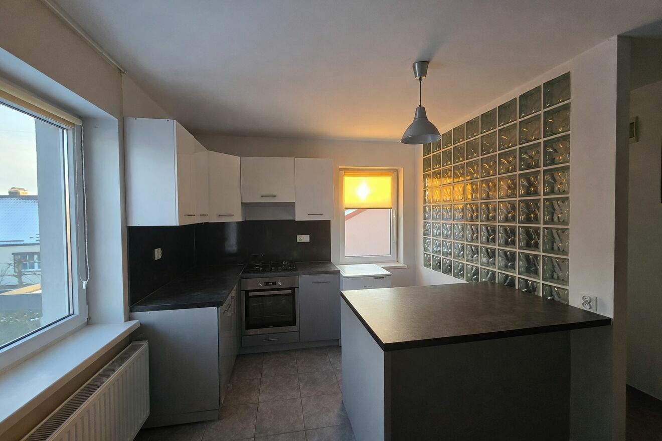 W cenie pozostaje: duża, pojemna szafa przesuwna oraz zabudowa kuchni z wyspą.